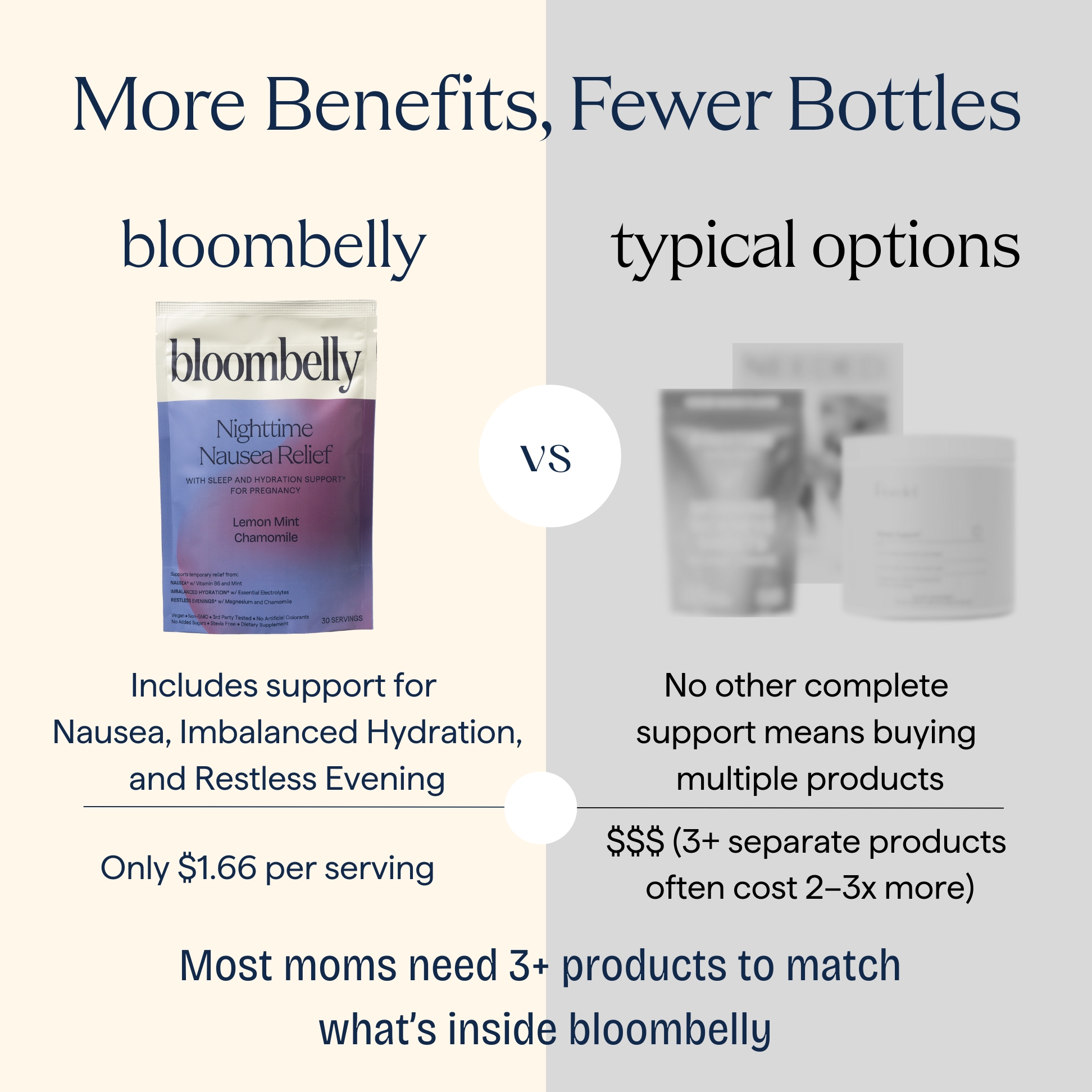 Most moms buy separate sleep teas, nausea remedies, and hydration powders — spending $3 to $4 per serving or more. bloombelly combines it all in one clean, delicious nighttime drink for just $1.66 per serving. Better for your body, your wallet, and your peace of mind.